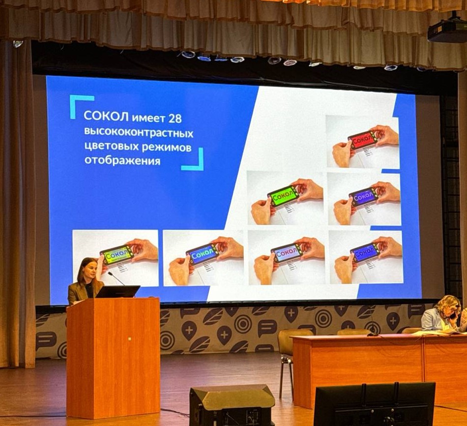 С темой «Инновационные технологии российского производства для незрячих и слабовидящих людей» выступила Показаньевна Анастасия - заместитель руководителя отдела по работе с клиентами B2C компании «Круст». Презентация видеоувеличителя «СОКОЛ» и тифлофлешплеера «ВОЙСА» имела успех, мы благодарны зрителям за внимание и приятный отклик.