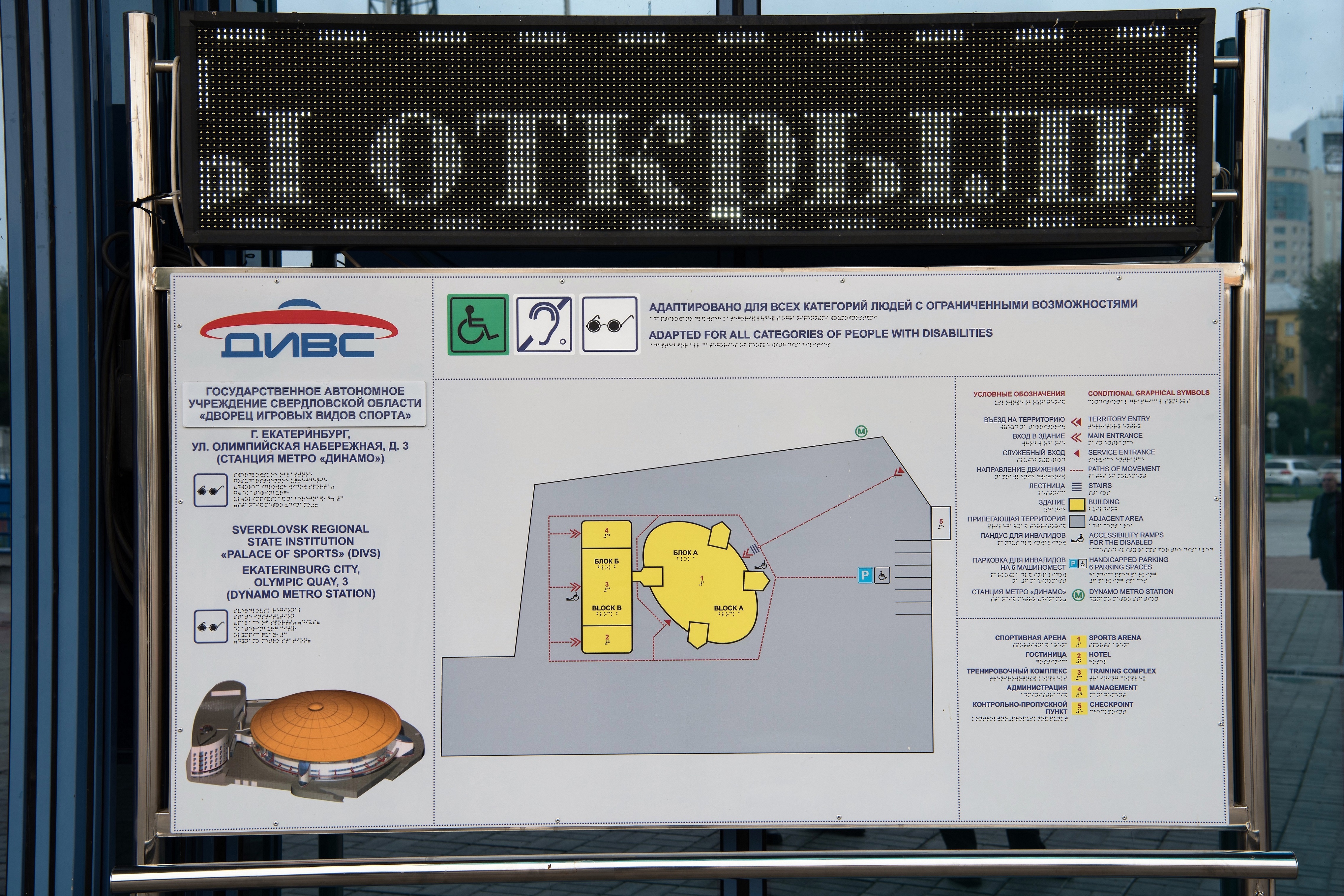 We improved the mentioned Palace with consideration to all categories of disabled people: we mounted ramp, hand rails, installed mimic diagrams, made contrast markings and other accessibility signs. We implement comprehensive adjustment inside the sports complex.